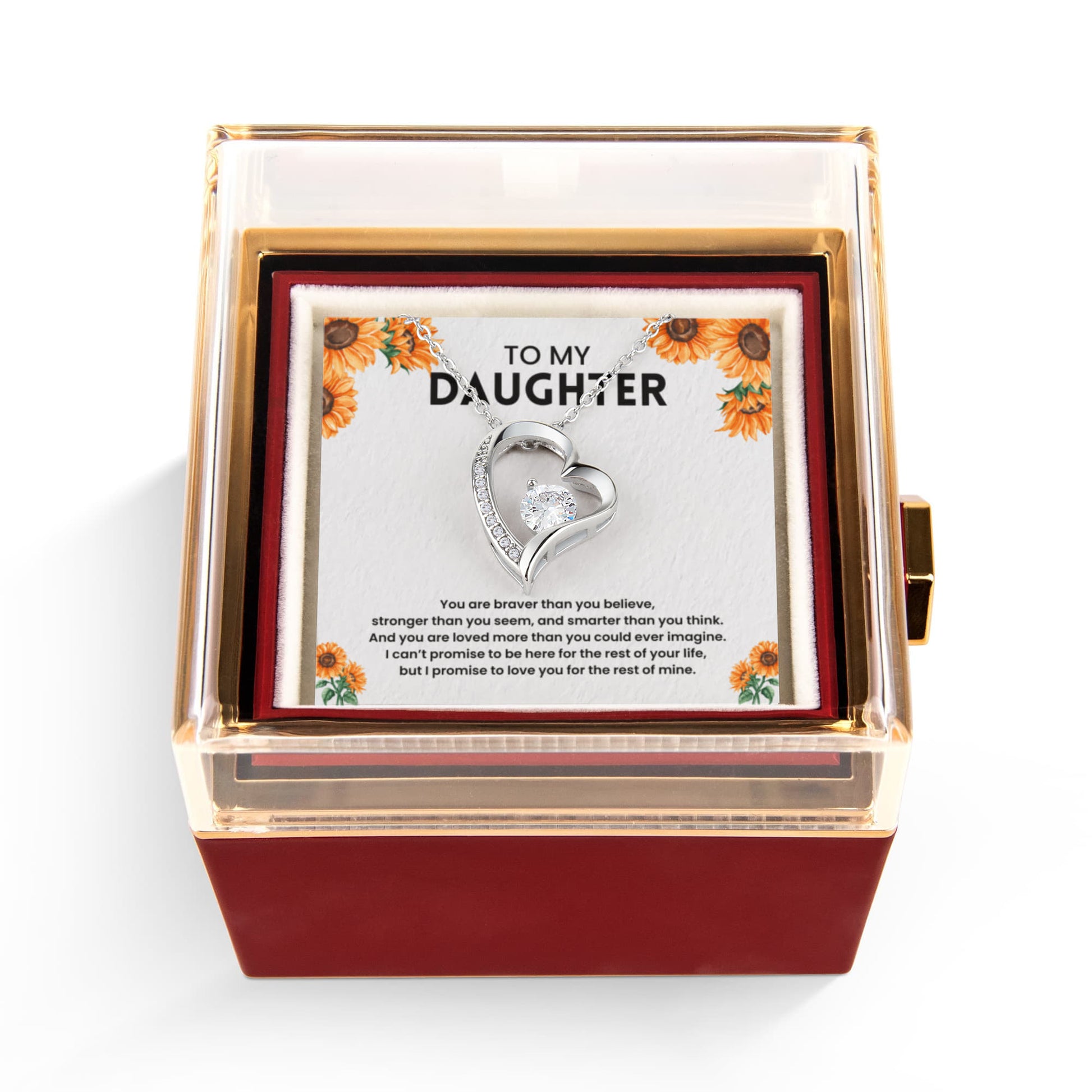 Imagine her reaction as she receives this beautiful Forever Love Necklace. The luxurious box, featuring a charming preserved rose that never fades, adds an extra touch of love. With a simple turn of the gold knob, her breathtaking gift is revealed—making it the perfect sentimental gift for that special someone.