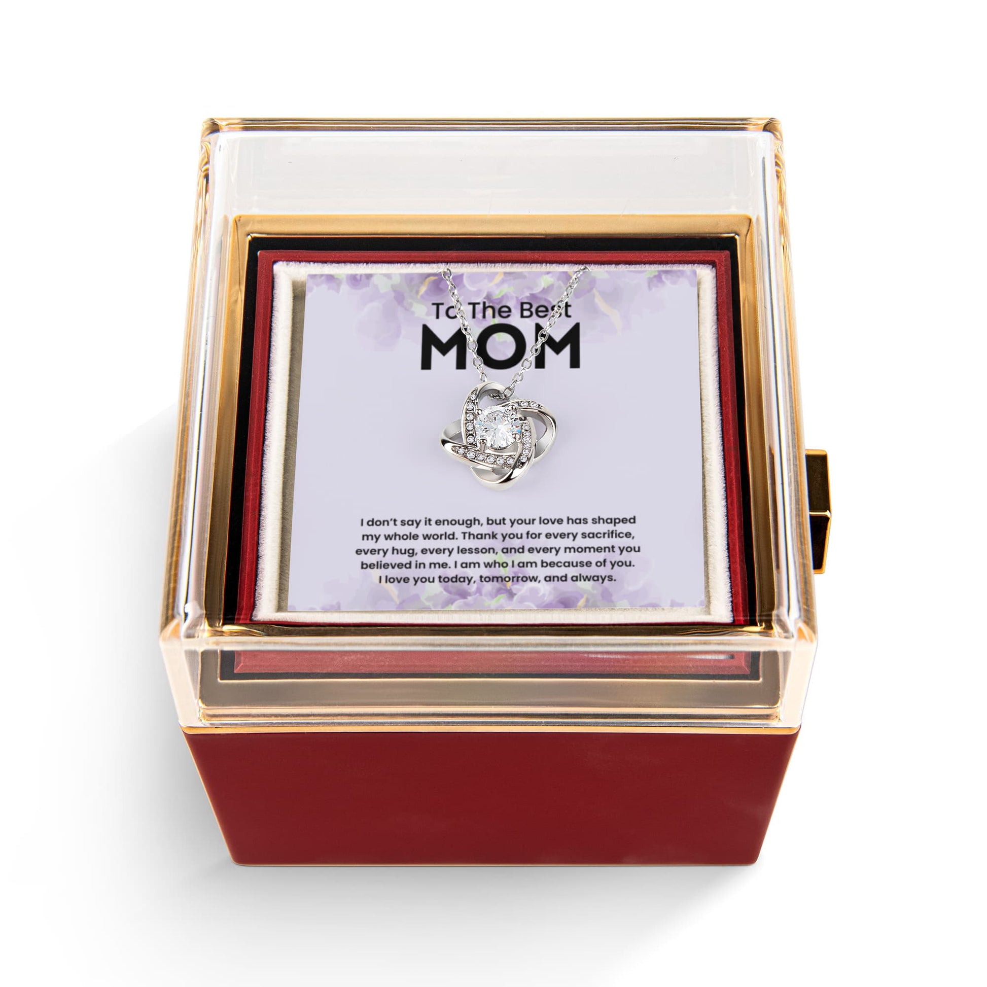 Imagine her reaction as she receives this beautiful Love Knot Necklace. Representing an unbreakable bond between two souls, this stunning pendant is adorned with premium cubic zirconia crystals, making it a timeless symbol of love and devotion. The luxurious box, featuring a meticulously preserved rose that never fades, adds an extra touch of love. With a simple turn of the gold knob, her breathtaking gift is revealed—making it the perfect sentimental gift for that special someone.